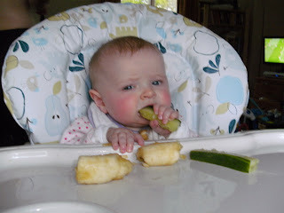In our first week we have tried broccoli, carrot, melon, pineapple, banana, cucumber and pear. All of which we have seen bit and pieces in her nappies, so something must be going in. Eating isn't the objective for the moment!